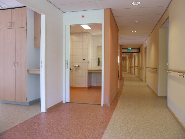 Warm colors like orange, yellow, pink, or red can be used as an accent color in entrance and waiting areas to welcome the children. Consider light blue or green for corridors, as well as for consultation and treatment rooms because those colors have a relaxing and calming effect. Bright colors and playful patterns reflecting animals or nature can be applied to the public zone within the patients’ area. Just as with dementia patients, introducing color in pediatric patient rooms can stimulate the appetite of the children.