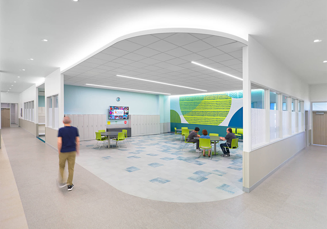 Once clients enter under the large, covered drop-off canopy, movement is essential in the facility, whether it’s physically travelling from one area to another or feeling the vibrancy and pulsation of life throughout the day. A curvilinear recessed soffit, with linear baffles and lights winds its way along the circulation spine of Main Street and contributes to the consistent essence of movement. The floor pattern, in a soft yellow tone, mimics the serpentine soffit above and gently invokes the journey of the iconic yellow brick road.