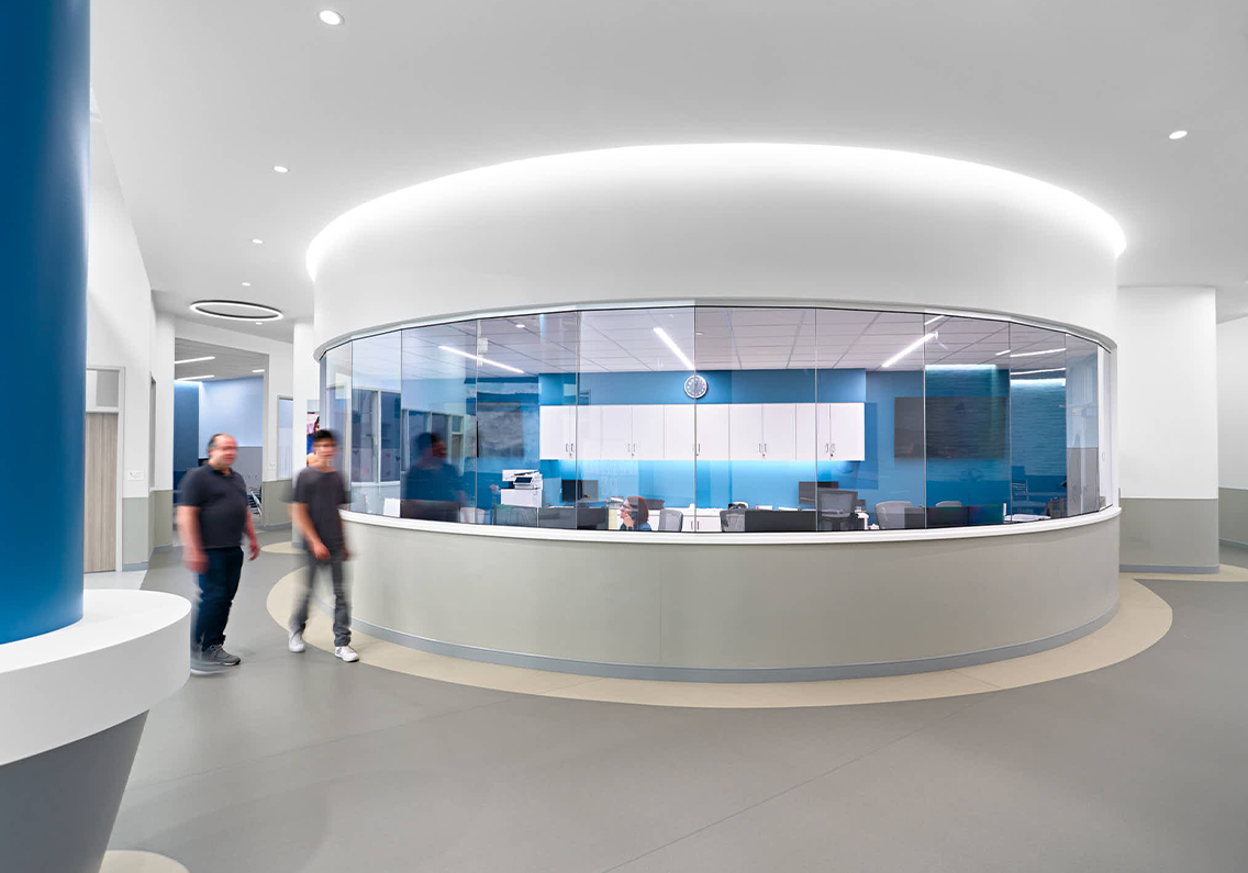 To further enhance the vibrancy created by diverse ceiling heights, light coves mark these ceiling variations featured in the program areas. A variety of lighting techniques throughout the center generates visual interest. For example, color-changing lighting that is programmed for green in the morning, signaling ‘go’ to start the day, and switching to yellow, red or other hues later on, outlines the program area portals. Additionally, large circular fixtures in the ceiling correspond to the intersections of avenues. The original entrance with its atrium area still serves as the entry point for staff and visitors and is another source of uplifting natural light.