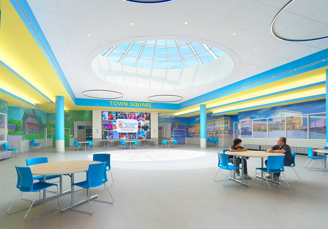 It’s the quintessential small Village, with an airy Town Square and bucolic Main Street easily navigated by the clients heading to physical therapy, a mock supermarket or the various other workrooms created in New Concepts for Living in Paramus, NJ. The 80,000 square-foot daycare facility for adults with intellectual and developmental disabilities shines as a sustainable adaptive reuse of a former two-story Barnes & Noble.